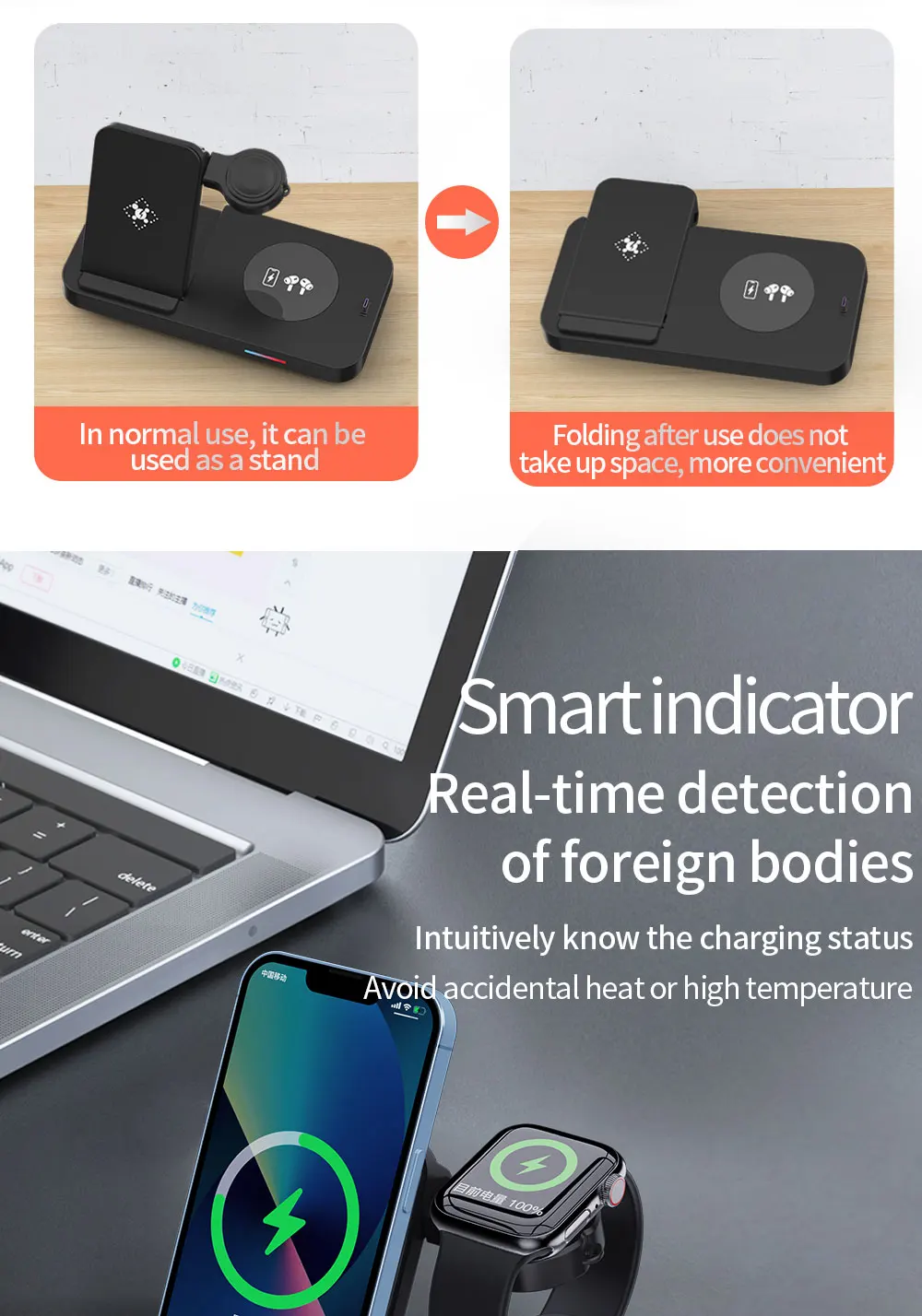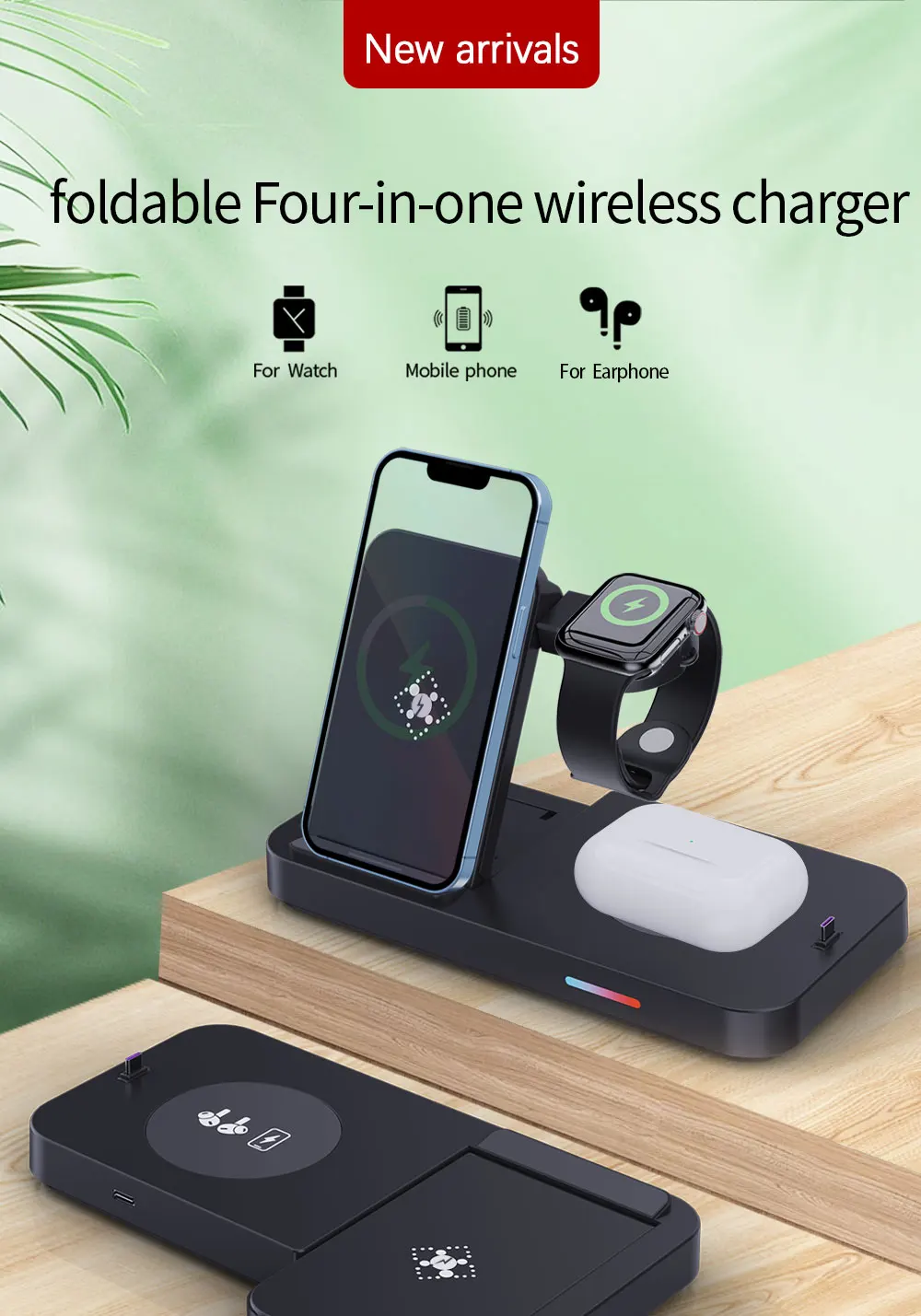 شاحن لاسلكي سريع 4 في 1 15 واط حامل محطة شحن قابلة للطي لساعة أبل سامسونج هواوي آيفون 14 13 12 برو ماكس AirPods